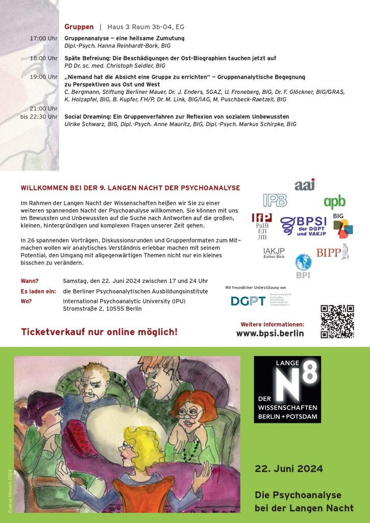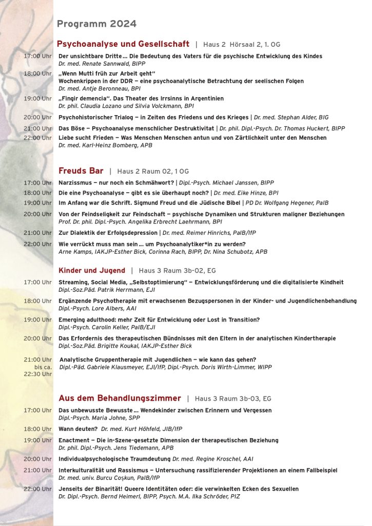 Auch dieses Jahr heißen wir Sie wieder herzlich zu einer weiteren spannenden Nacht der Psychoanalyse willkommen! Psychanalytiker:innen gehen mit Ihnen auf die Suche nach aktuellen Antworten auf Fragen, die wir uns tagtäglich zu Themen wie Neid, Mut, Gesehenwerden, Krieg, Rassismus, Homosexualität, Männlichkeit, Tätowierung, gegenwärtige konter revolutionäre Bewegungen u.v.m stellen, und erlauben somit spannende Blicke „hinter die Kulissen“ — wie Psychoanalytiker:innen denken und arbeiten. Die 8. Lange Nacht der Psychoanalyse wird in 30 Vorträgen zeigen, inwiefern Psychoanalyse den Blick und damit das Verständnis auf gegenwärtige Themen verändern kann.